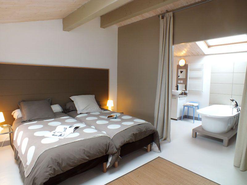 Deux lits jumeaux en 190, commode, penderie et une salle de bain privée avec baignoire îlot et WC.
